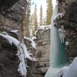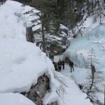 Start by heading over Fifth Bridge.. for winter hiking I recommend staying along Maligne river, as the trail itself climbs along the river and has icy patches in February. The river is very shallow in the winter and it’s easy to pick your way around the rock patches. If you follow the river along, you can get back on the trail in places if you like, there are some areas you’ll have to navigate around. Make sure you listen for hollow sounds on the ice as you walk, and find a way around when you do. As you stick to the river, the canyon walls get higher and higher, so you’ll want to stay in the canyon rather than on the trail wherever possible. Once there, throw on your cleats and have some fun. There are ice climbers climbing the waterfalls usually, so please make sure you DO NOT cross underneath their ropes while they are climbing. Their ice axes constantly bring down ice while they are climbing, The canyon bottom usually has around 4 to 6 inches of ice in it. You need about 1inch of clear ice for every 500lbs of weight to safely walk on it. There isn’t a ton of wildlife around, but you usually see elk, mountain sheep, and the odd mountain goat around.